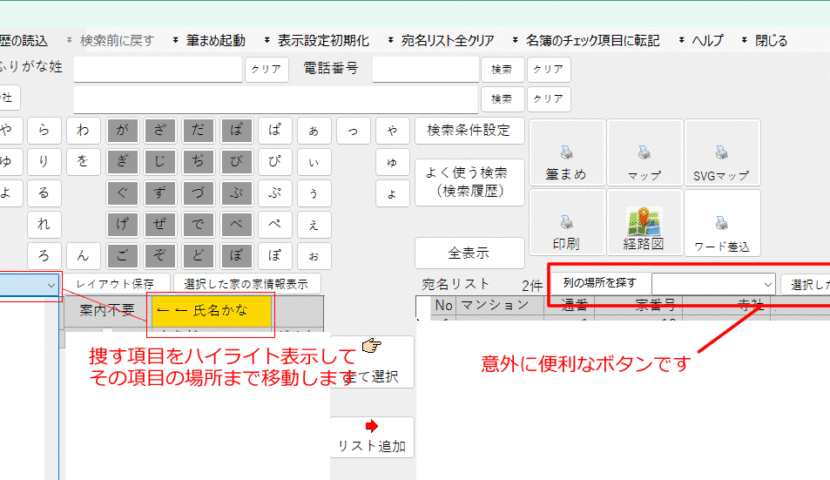 『宛名書き』画面に「家情報表示」「列検索」ボタンを追加しました