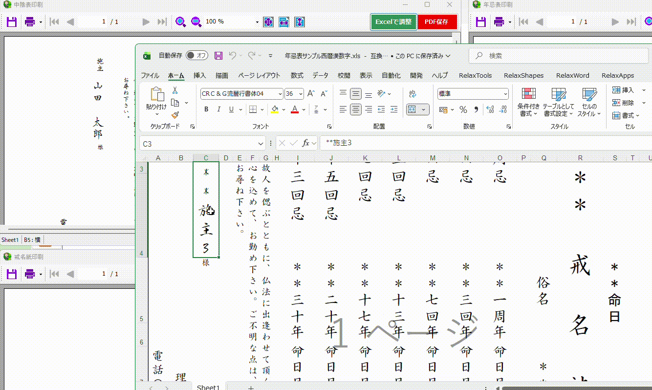 中陰表のボタンの名前と、紐づけられるエクセル帳票は、過去帳編集画面でのツールバー「印刷」⇒「印刷ファイル設定」で設定してください。