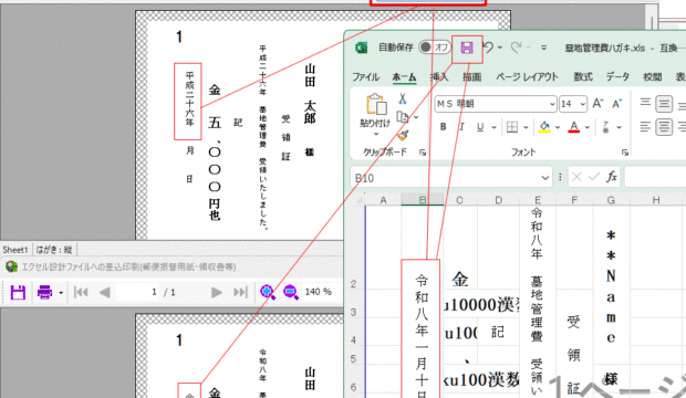 (例:)一太郎の文書内の田中次郎(家番号は843なので)という文字にハイパーリンク「sinsara:843」を設定し、クリックするとシンサラの田中家情報が表示される画面キャプチャ