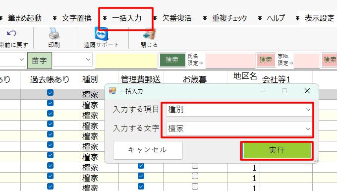 (5)絞り込まれたその状態で一括入力「檀家」