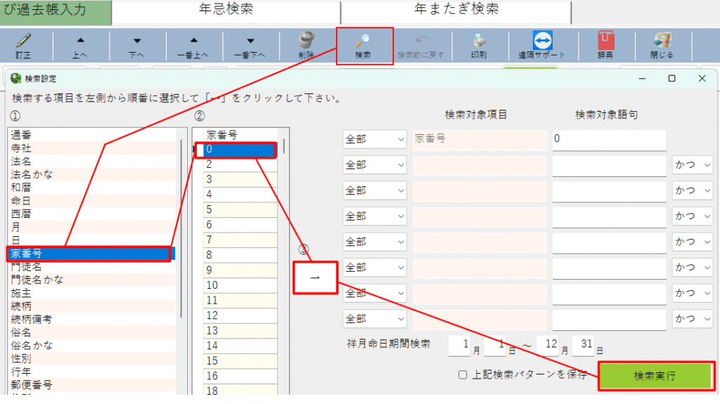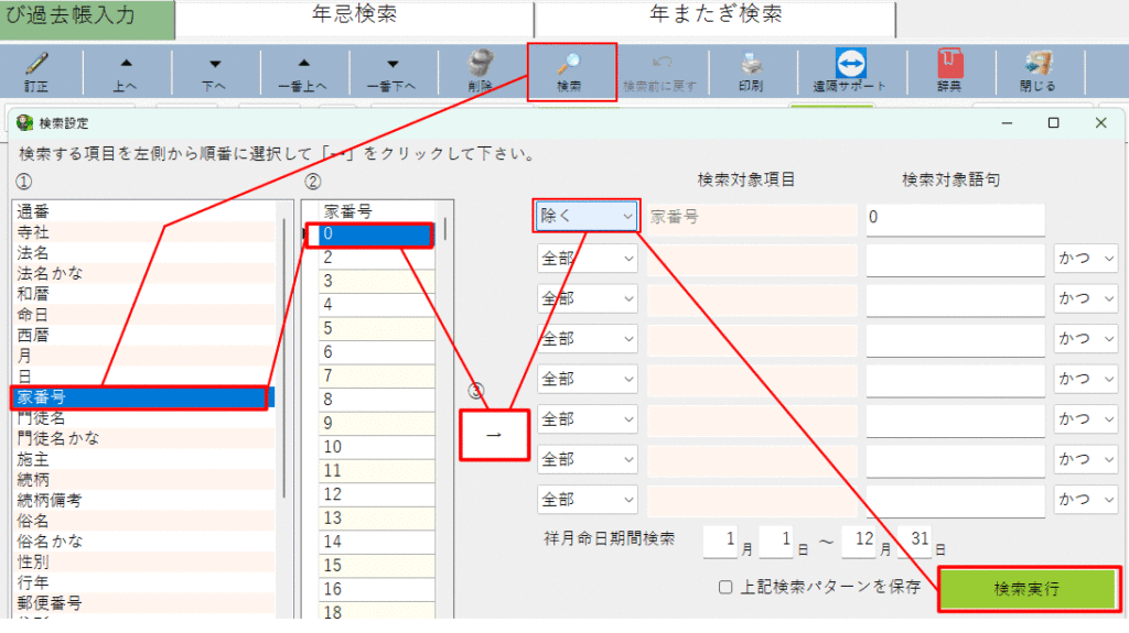 (2)次に、過去帳一覧で検索アイコンより、「家番号<>0」0を除く検索をおこなう