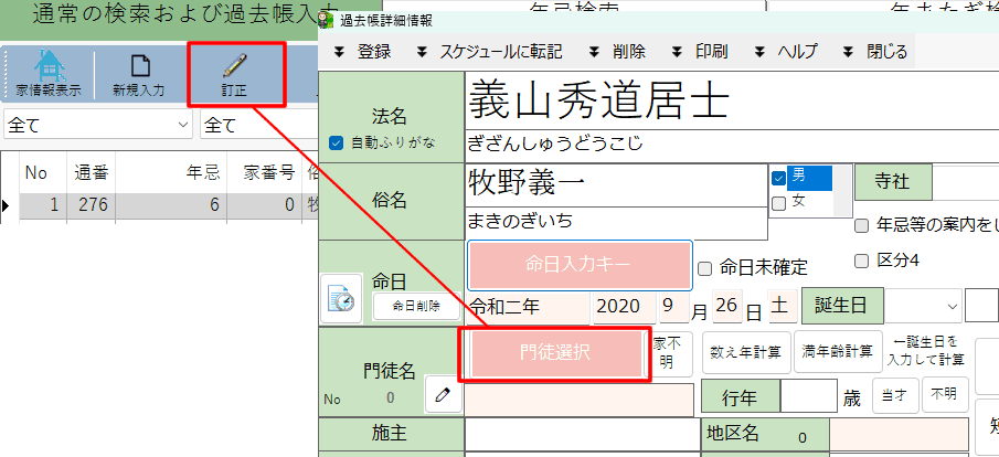 以前お使いのシステムにて、正しく過去帳と名簿がリンクされていないので、『過去帳の施主と檀家名簿」の中に同姓同名がいたら、便宜上、まず家番号をリンクさせて、チェックをする、、、という方が効率的です。