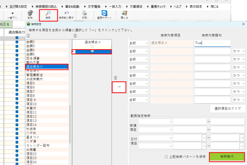 (4)世帯主名簿を開き、検索アイコンより、「過去帳あり」の検索をおこなう