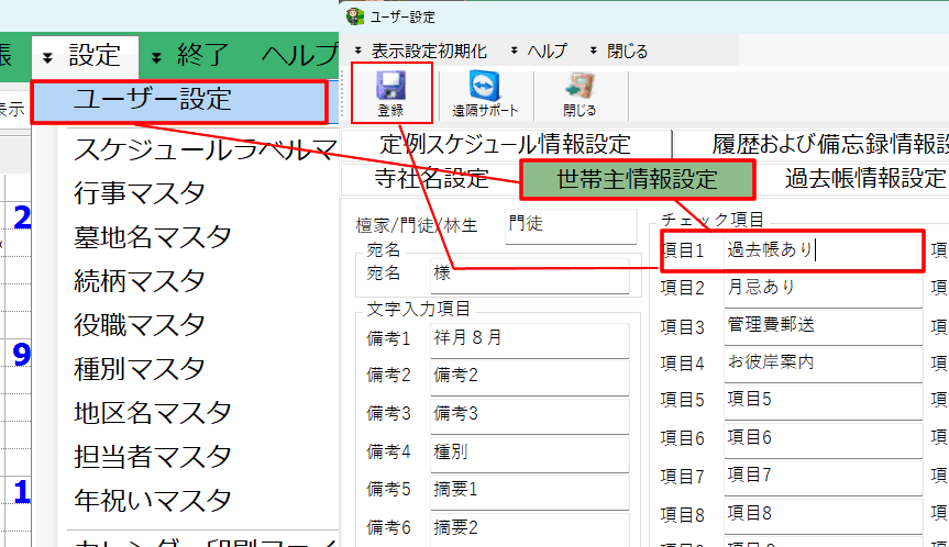 (1)「ユーザー設定」の「世帯主名簿」空いているチェック項目の1つを「過去帳あり」に変える⇒登録して閉じる