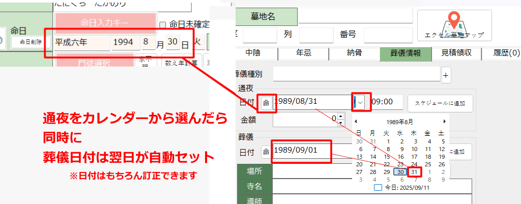そして、通夜の日を入力すると、葬儀日はその翌日に自動セットされるようにしました。