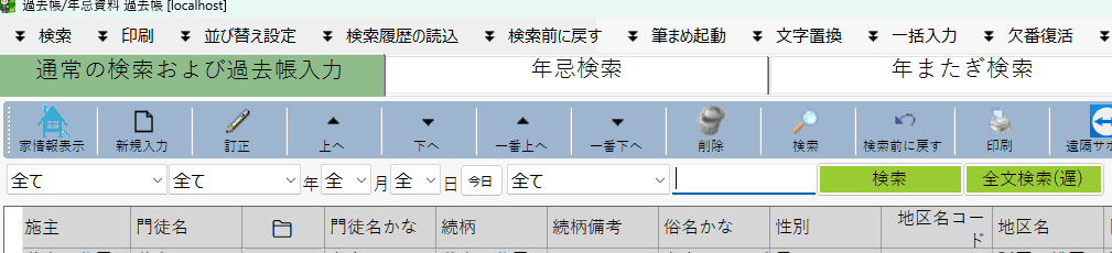 過去帳⇒フリーワードの横に「検索」と「全文検索(遅)」を設置しました。