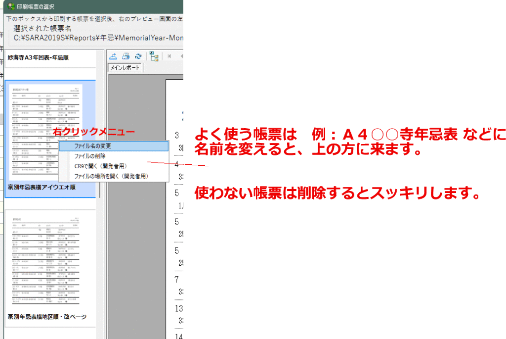 よく使う帳票は 例:A4○○寺年忌表 などに名前を変えると、上の方に来ます。