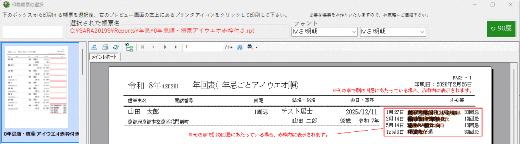「赤枠付き」とは、その年の月別表示・年忌別表示のページで、「同じ家で他の月・他の年忌もあたっている」場合、赤枠内に表示する、、、という帳票機能です。