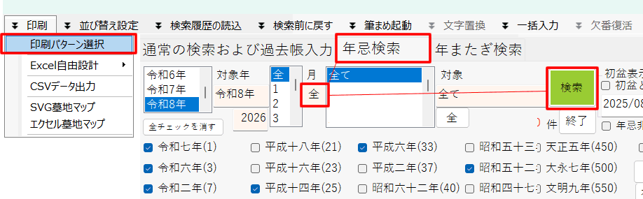 この帳票は、過去帳➔年忌検索⇒全月で検索すると発揮する帳票です。