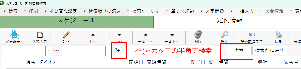 「間違えて、祥月追加ボタンを押してしまった」時は、、、スケジュール一覧画面で「祥(」 ※カッコは半角( です。